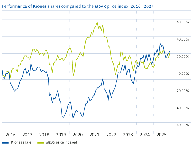 The past ten years from 2016 to 2025 have seen our share price increase by 23%. Krones’ average annual share price gain over the ten-year period comes to 2.1%. The MDAX Price Index – the MDAX excluding dividends – gained an average of 1.8% per year over the same period. Krones shares are thus a slight outperformer over the long term. Including paid-out dividends, and assuming these were reinvested in Krones shares after payout, the average annual return on our shares since 2016 comes to 3.7%. Due to high dividend payments by index members, the comparable MDAX performance index rose by an average of 4.0% per year over the last ten years.