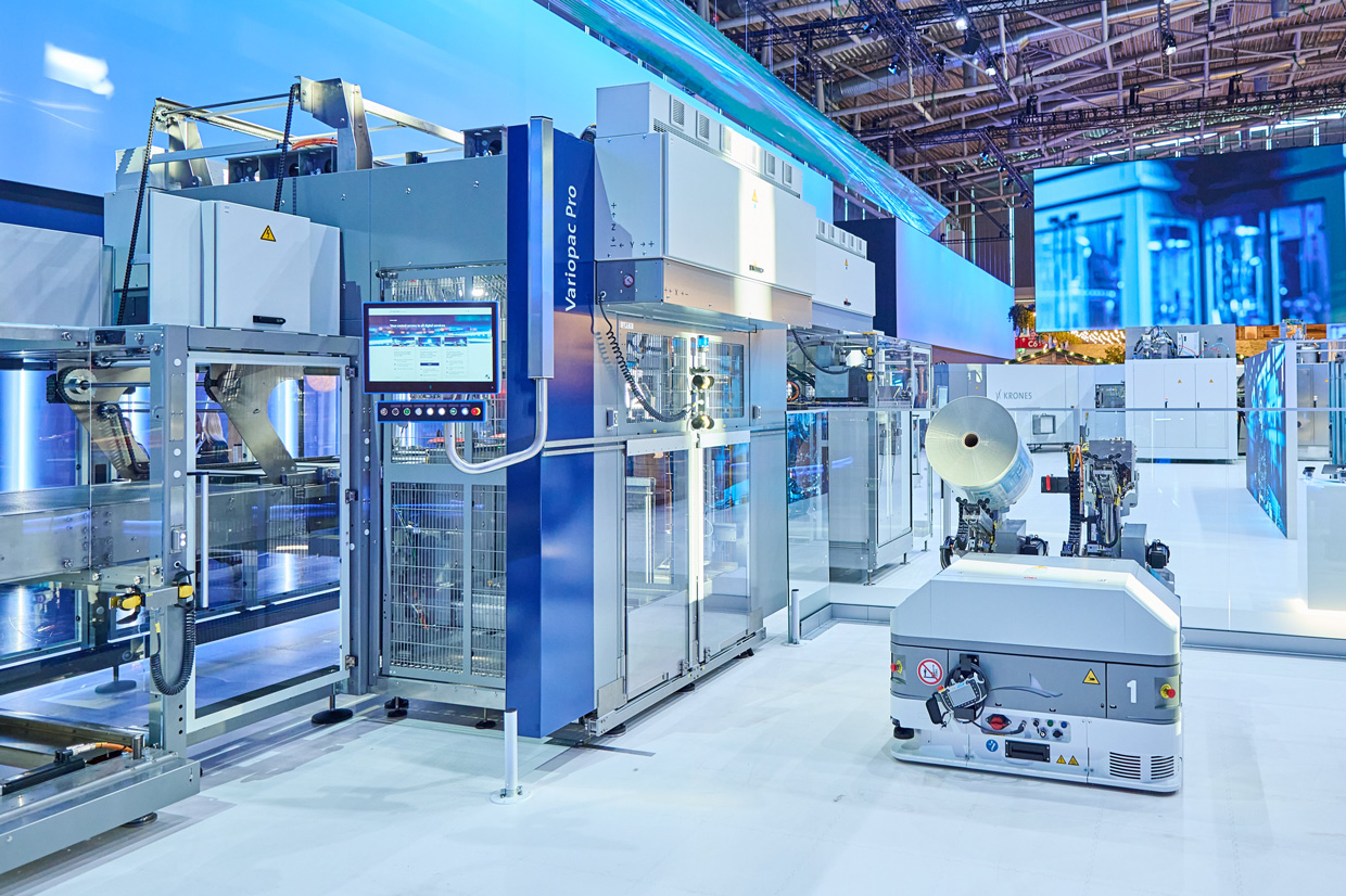 But that’s not all the Variopac Pro on show at interpack can do: It also provides fairgoers with a glimpse into the future of autonomous material supply, which is part of Krones’ autonomous material-handling concept Ingeniq. An automated guided vehicle (AGV) from our subsidiary System Logistics transports the packaging materials needed and feeds them into the Variopac Pro packer – controlled by a digital solution developed by the Krones Group. It serves as a practical example, demonstrating how routine tasks can be automated to significantly reduce the operators’ workload.