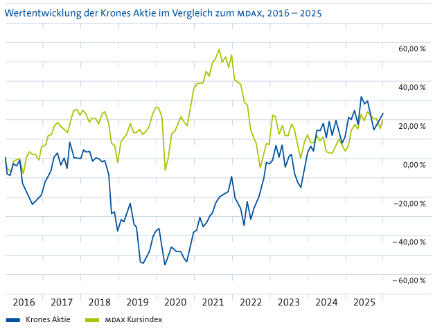 In den vergangenen zehn Jahren, also von 2016 bis 2025, stieg der Wert der Krones Aktie um insgesamt 23 %. Damit beträgt der durchschnittliche jährliche Kursgewinn der Krones Papiere in diesem Zeitraum 2,1 %. Der MDAX-Kursindex, also der MDAX ohne Dividenden, legte im gleichen Zeitraum im Durchschnitt um jährlich 1,8 % zu. Die Krones Aktie zeigt also im Langfrist-Vergleich eine leichte Kurs-Outperformance. Inklusive der Dividenden und der Annahme, dass die Ausschüttungen jeweils wieder in Krones Aktien angelegt wurde, errechnet sich für die Krones Aktie seit 2016 eine durchschnittliche jährliche Rendite von 3,7 %. Der vergleichbare MDAX-Performance-Index stieg in den vergangenen zehn Jahren aufgrund hoher Dividendenzahlungen der Index-Mitglieder um durchschnittlich 4,0 % im Jahr.