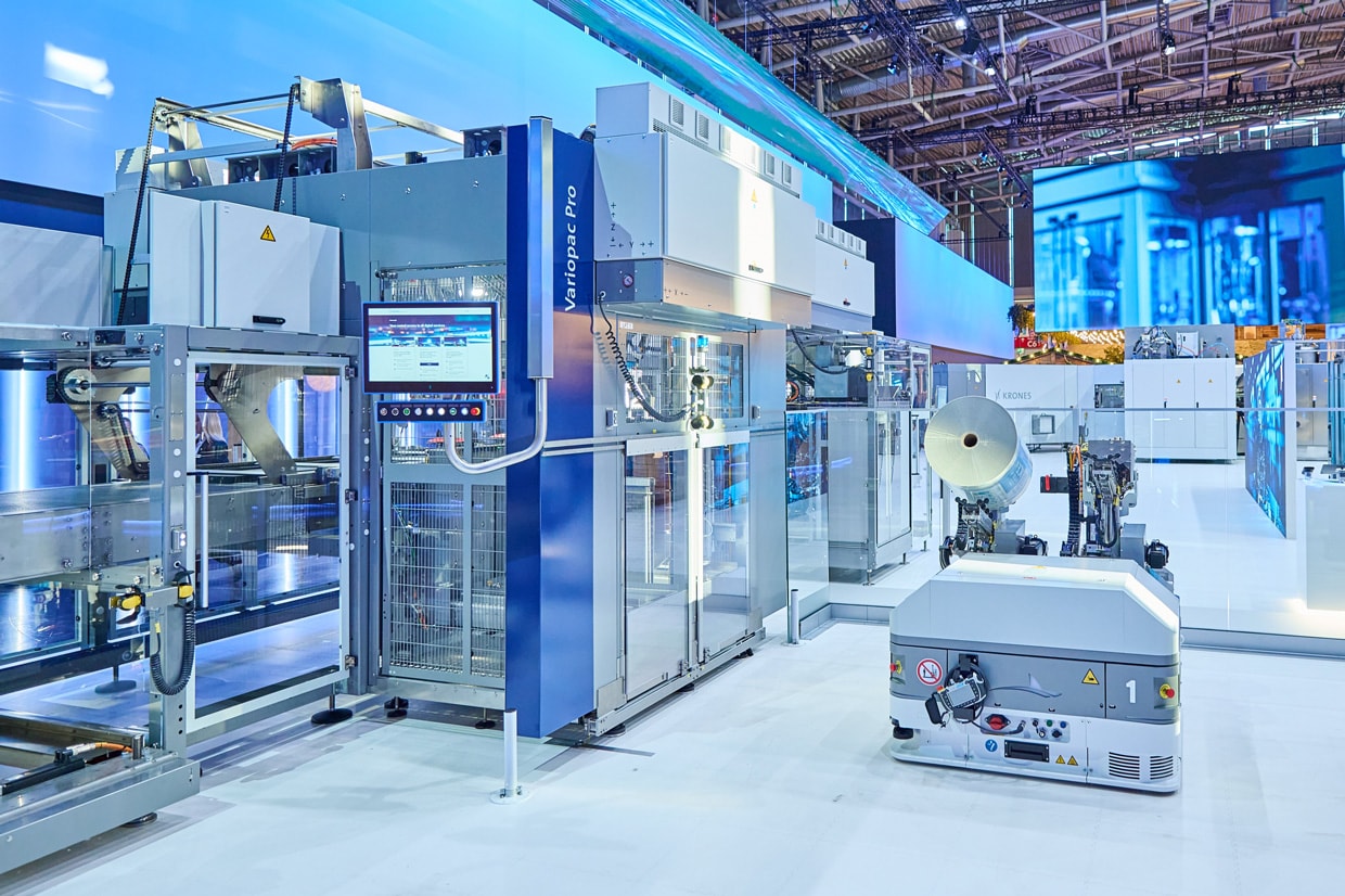 Variopac Pro在interpack展会上的作用还不止于此:它还能让人们一窥自主物料供应的未来。这是Ingeniq概念框架下自主物料输送的一部分。我们子公司System Logistics的自动导引车(AGV)负责包材运输,并将其放入Variopac Pro--利用克朗斯集团提供的数字化解决方案进行控制。借此,我们在interpack展会上推出了一个实际案例,说明如何实现常规任务的自动化,并显著减少操作工作量。