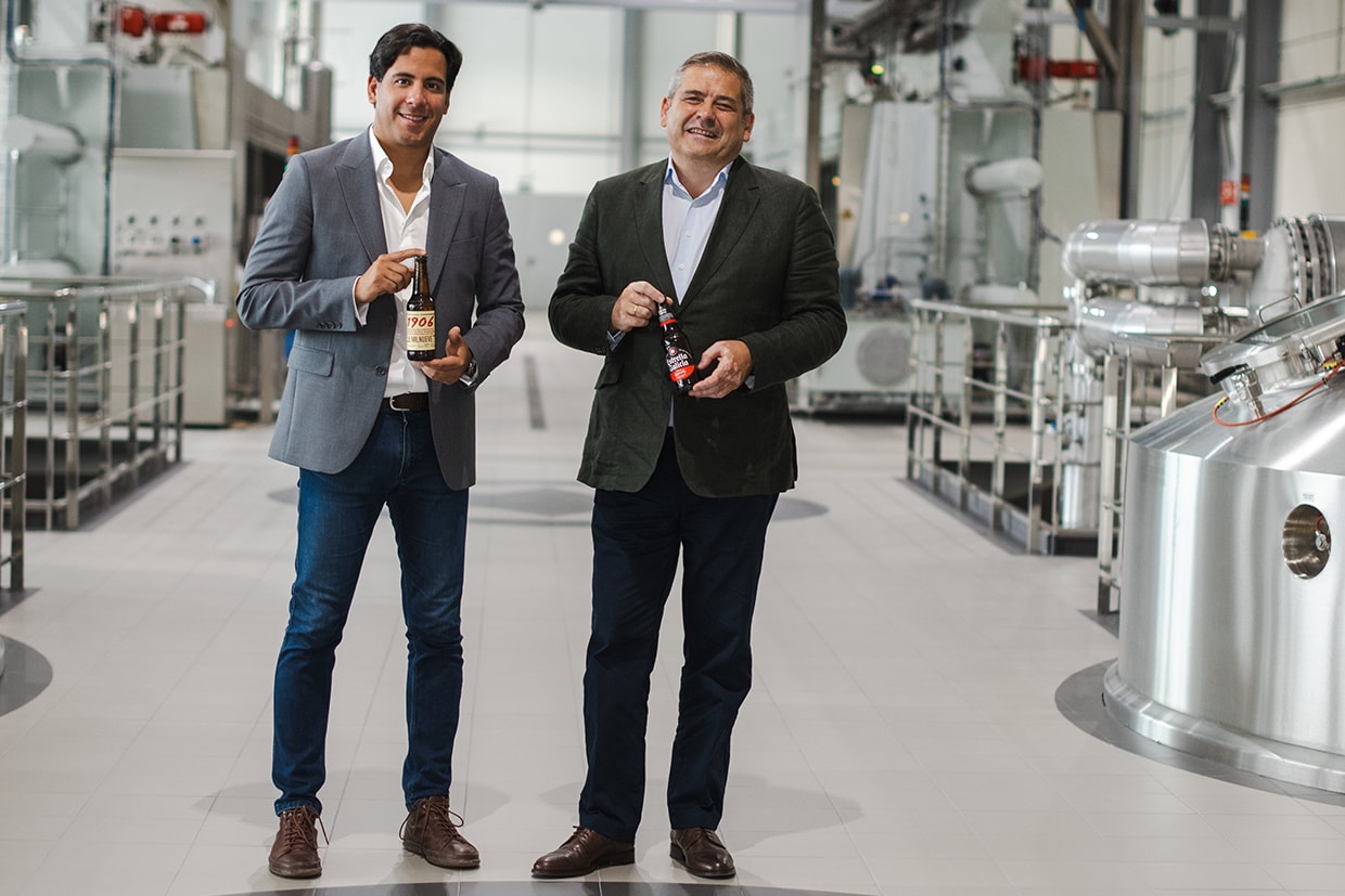 对斯坦尼克提供给Estrella Galicia公司的全新啤酒设备赞不绝口:Nicolás Deus(全球运营总监)和Miguel Calvo(工程总监)。